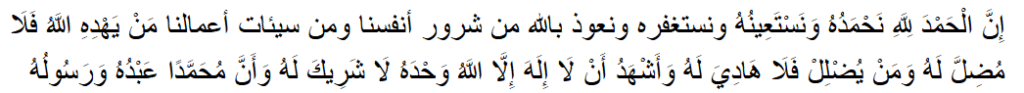 Innal hamda lillah nahmaduhu wa nasta’eenuhu wa nastaghfiruhu wa na’oodhu billahi min shuroori anfusinaa wa min sayyi-aati a’maalinaa; man yahdillahu falaa mudilla lah, wa man yudlil falaa haadiya lah; wa ash-hadu allaa ilaaha illa Allahu wahdahu laa shareeka lah, wa ash-hadu anna Muhammadan ‘abduhu wa rasooluh.