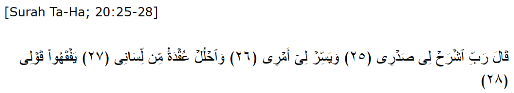 (Oh Allah, I ask you to expand my breast, make my task easy, undo the knot in my tongue so that my speech will become comprehensible) (Moses prayer).