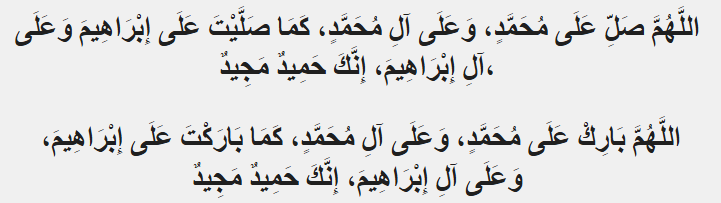 “Allaahumma salli ‘ala Muhammad wa ‘ala Aali Muhammad kama salayta ‘ala Ibrahim wa ‘ala aali Ibraaheem innaka hameedun majeed,Allahumma baarik ‘ala Muhammad wa ‘ala Aali Muhammad kama baarakta ‘ala Ibrahim wa ála aali Ibraaheem innaka hameedun majeed.